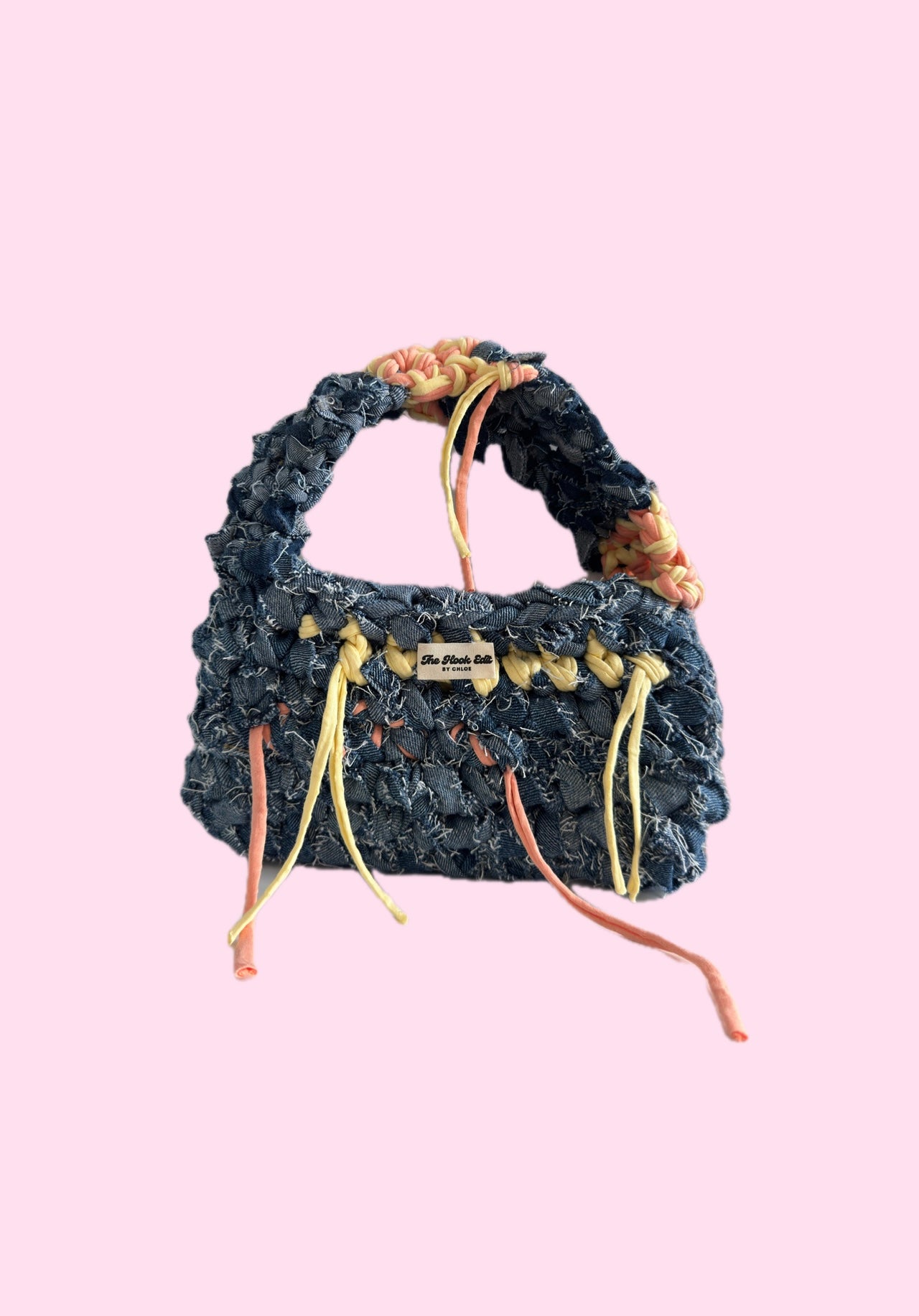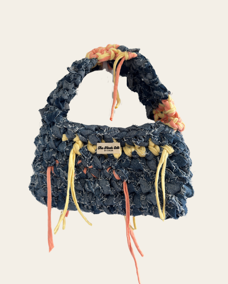Classic blue denim with sunlit pops of yellow and orange t-shirt yarn. Crocheted details, made to brighten every day.