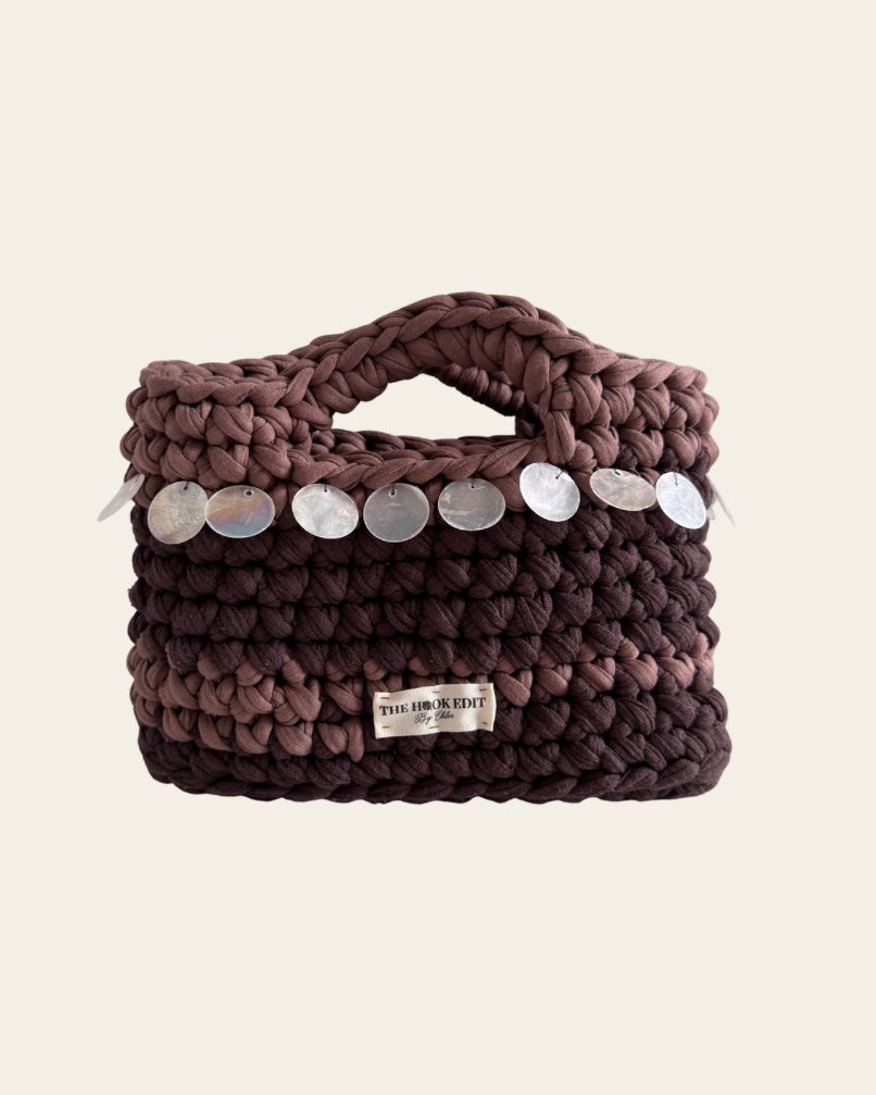 Two tones of rich brown t-shirt yarn, elevated with mother of pearl shell details. Subtle contrast, soft structure — this Belle is effortlessly bold.