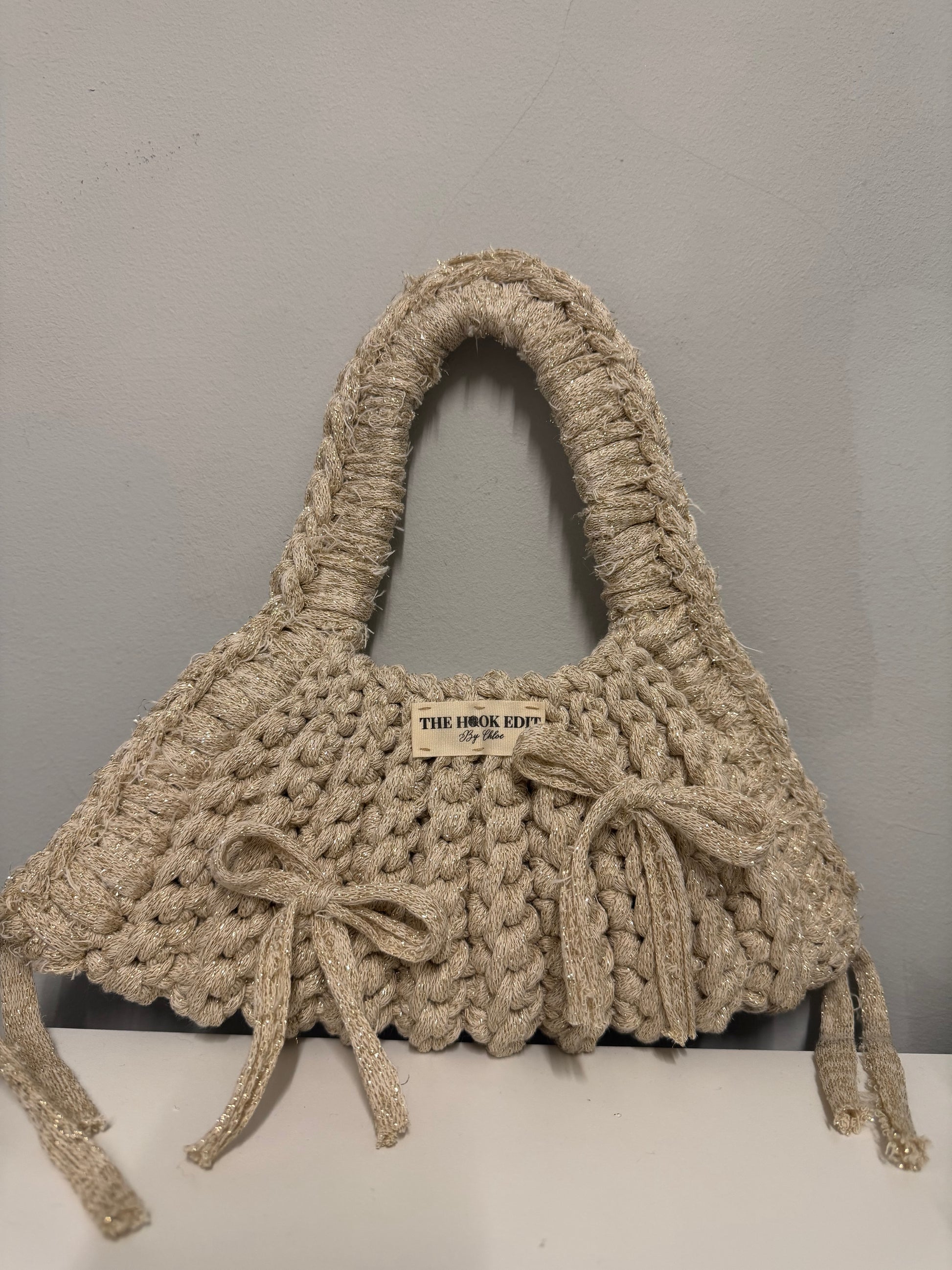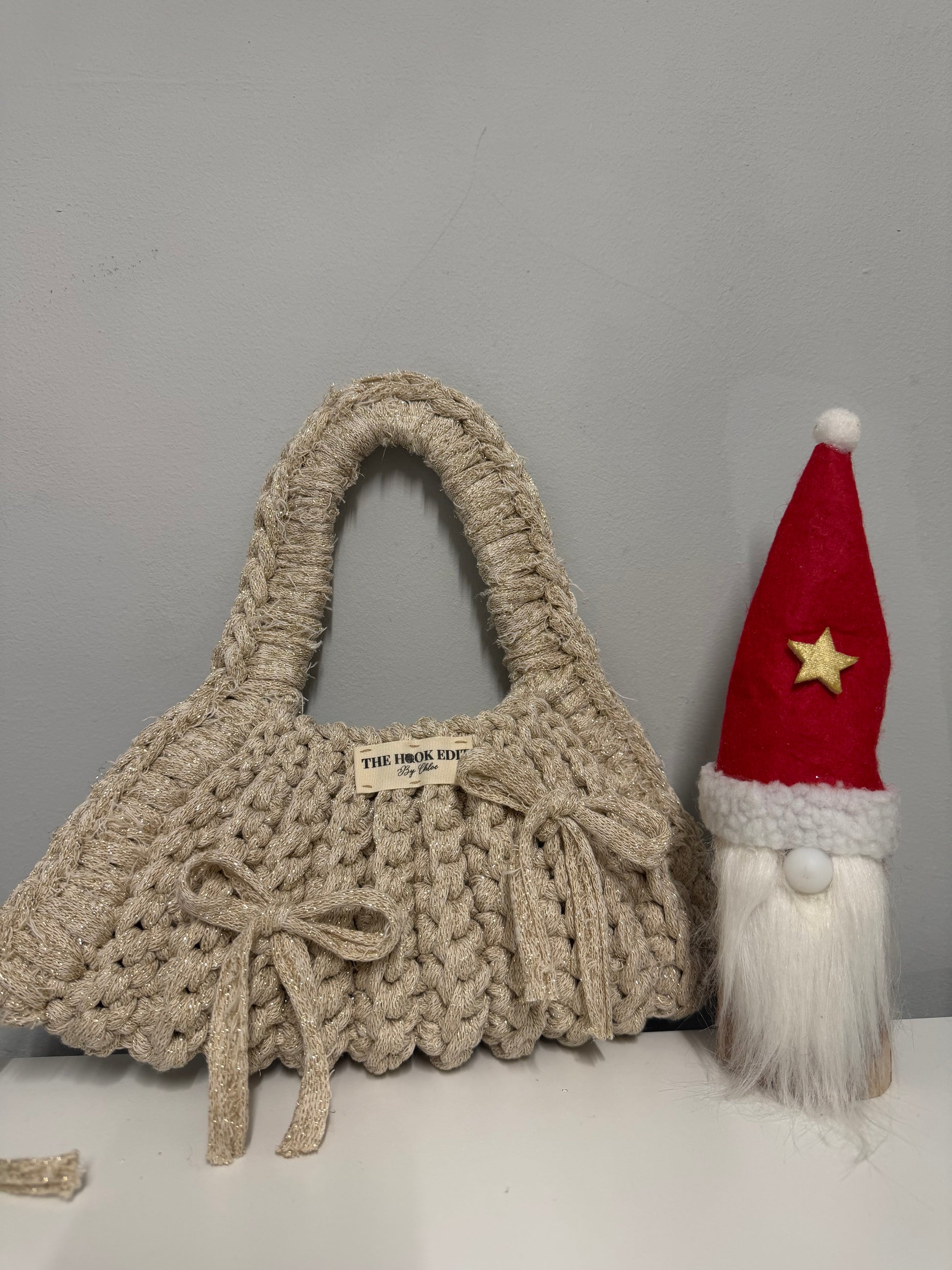 A hand-crocheted gold bag designed to shimmer with every step. Festive, elegant, and perfect for adding a touch of sparkle to any outfit this season.