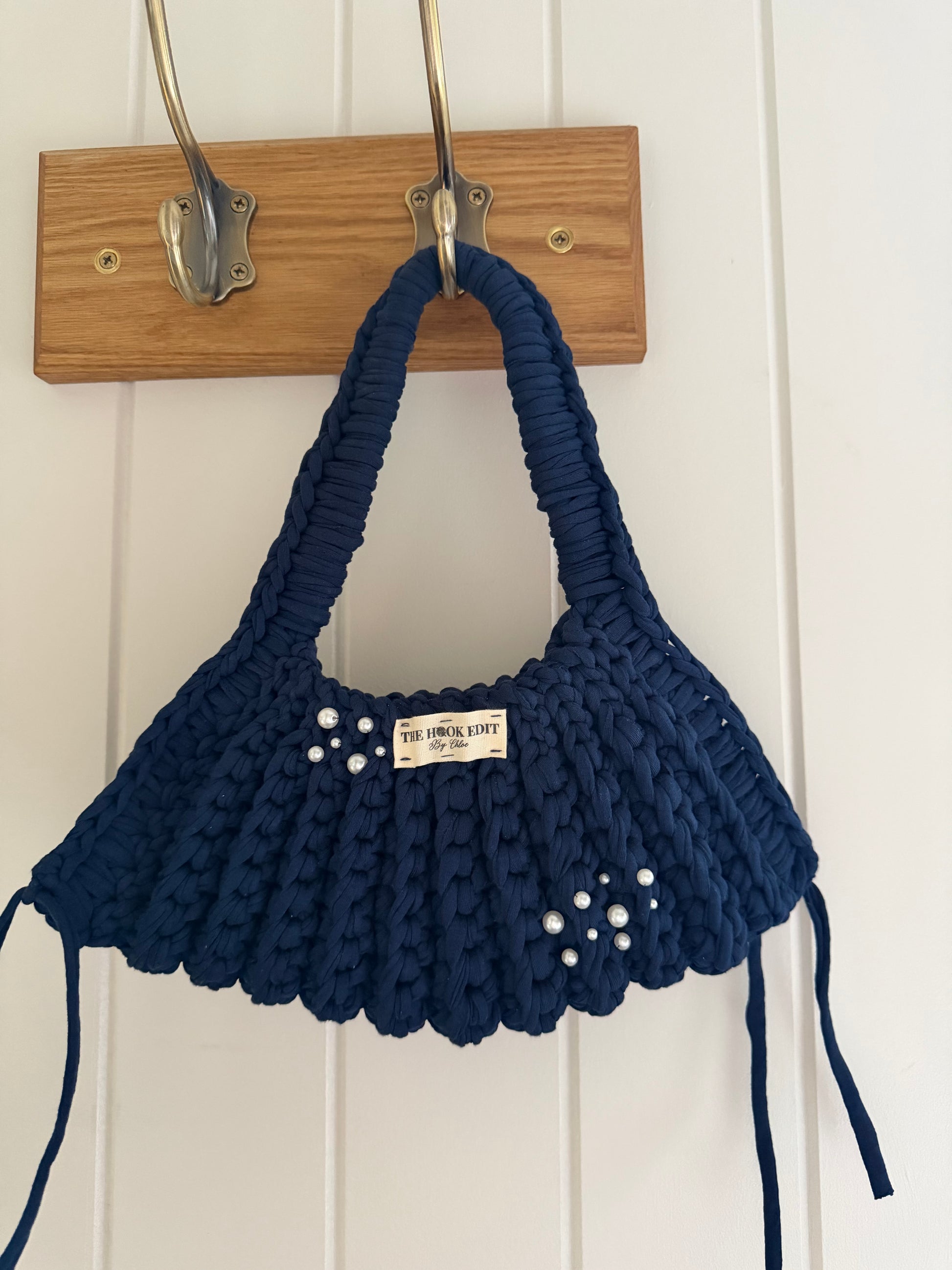 Delicate white pearls on a soft blue base give this bag an elegant, winter-inspired look - ideal for festive occasions and holiday style.